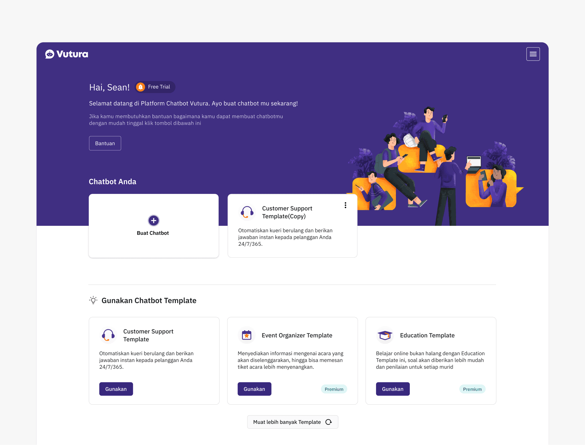The Vutura landing page provides essential tools and information for the business and marketing teams, also acts as a gateway to the no-code chatbot dashboard, along with links to support and pricing pages.
